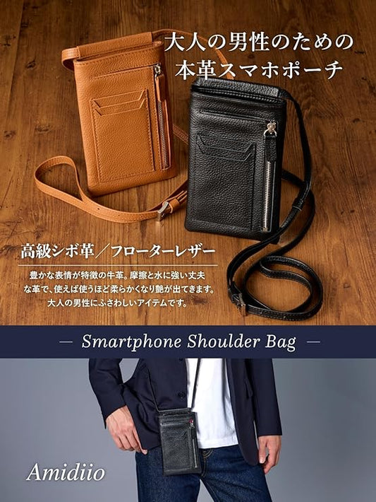 [amidiio] スマホポーチ メンズ 本革 レザー ショルダー 小銭入れ モバイル決済可 長さ調整機能 ブラック