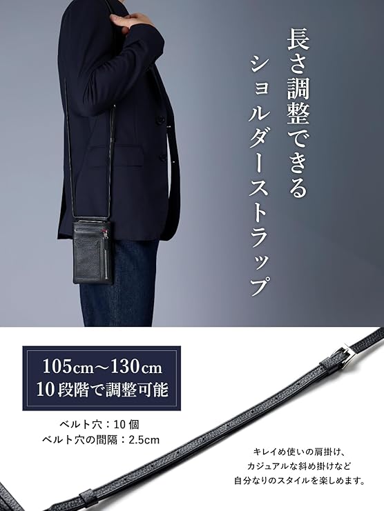 ベルト穴:10個、ベルト穴の間隔:2.5cm、105cm〜130cm、10段階でベルト調整可能です。キレイめ使いの肩掛け、カジュアルな斜め掛けなど自分なりのスタイルを楽しめます。